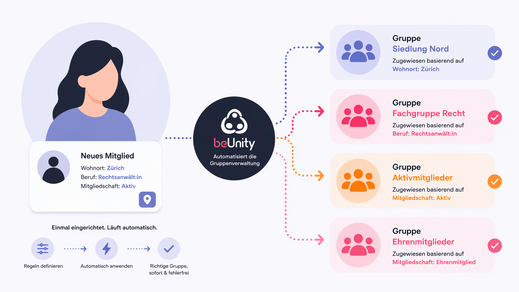 - 💼 Berufsverband: Mitglieder mit dem Beruf «Rechtsanwält:in» → automatisch in die Fachgruppe «Recht». Fachspezifische Inhalte, Veranstaltungen und Diskussionen landen direkt beim relevanten Publikum.